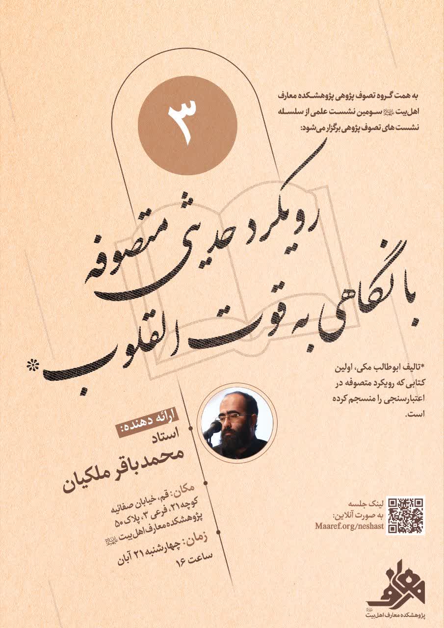 سومین نشست علمی از سلسله جلسات تصوف‌پژوهی، با عنوان «رویکرد حدیثی متصوفه با نگاهی به قوت‌القلوب» برگزار می‌شود